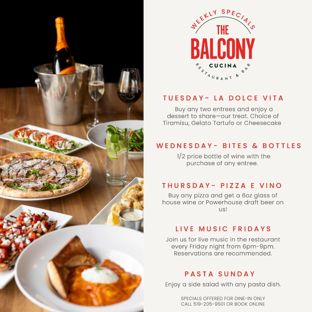 More than just a restaurant, The Balcony Cucina is a place to gather. Whether you’re celebrating a special occasion, enjoying a casual night out, or sharing a meal with family and friends, our warm hospitality and comfortable, finely appointed dining room set the tone. On Fridays, live music fills the space, adding to the welcoming atmosphere and creating moments worth lingering over.